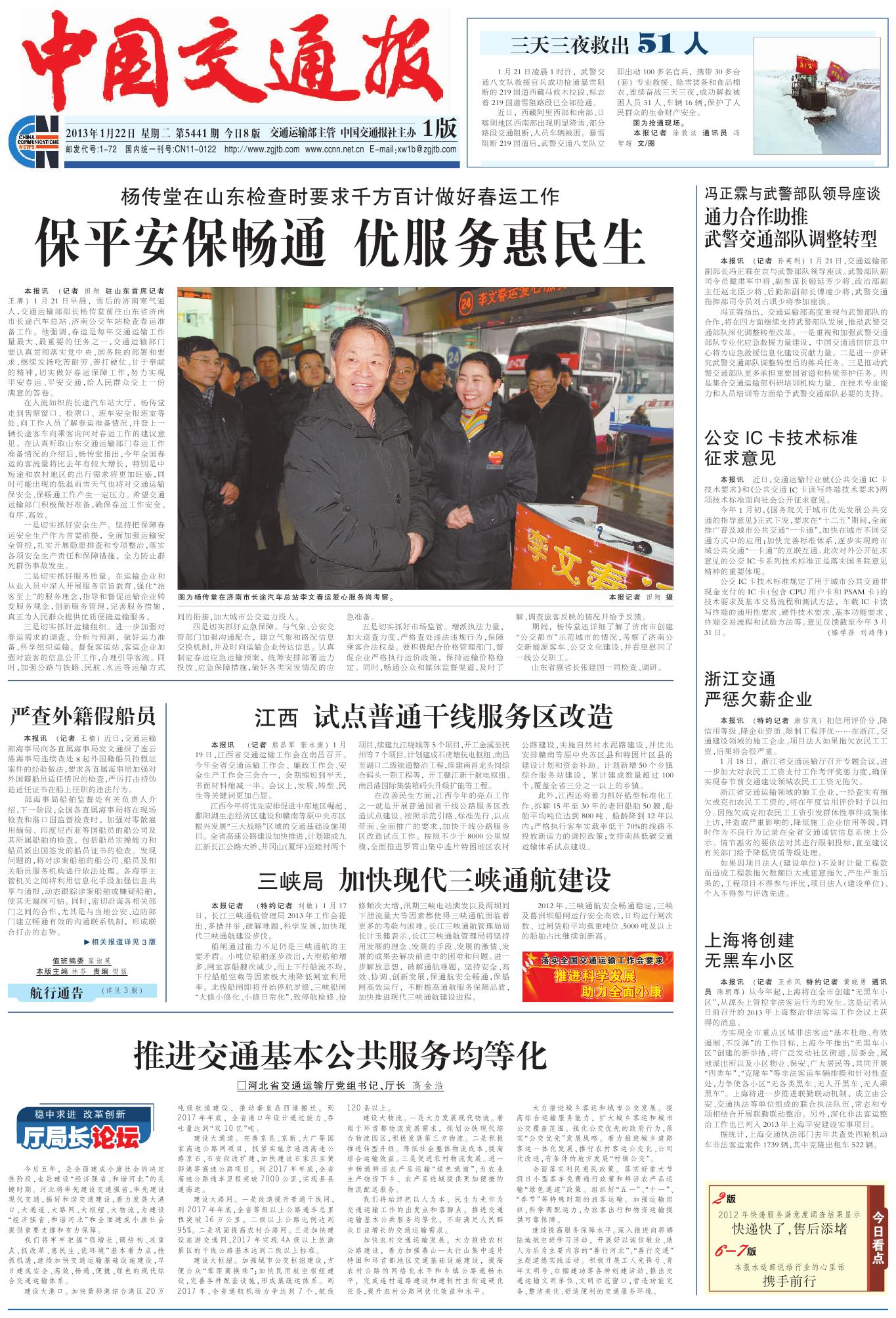 《中国交通报》——交通部部长杨传堂视察山东VSport团体春运事情